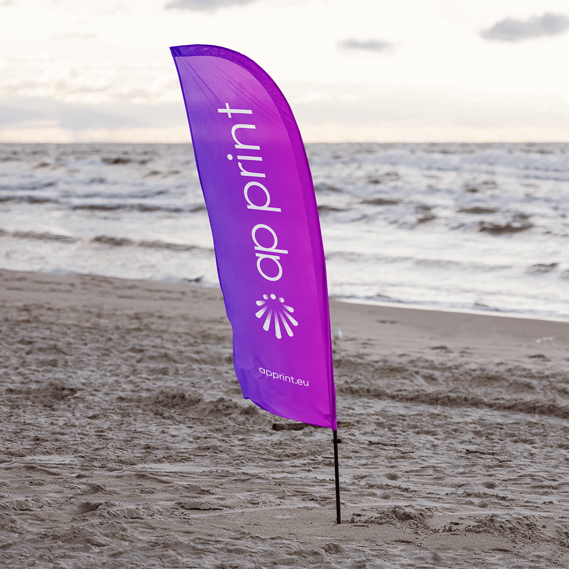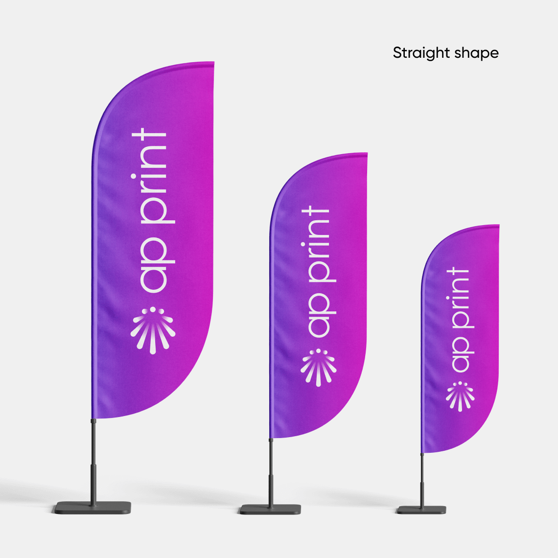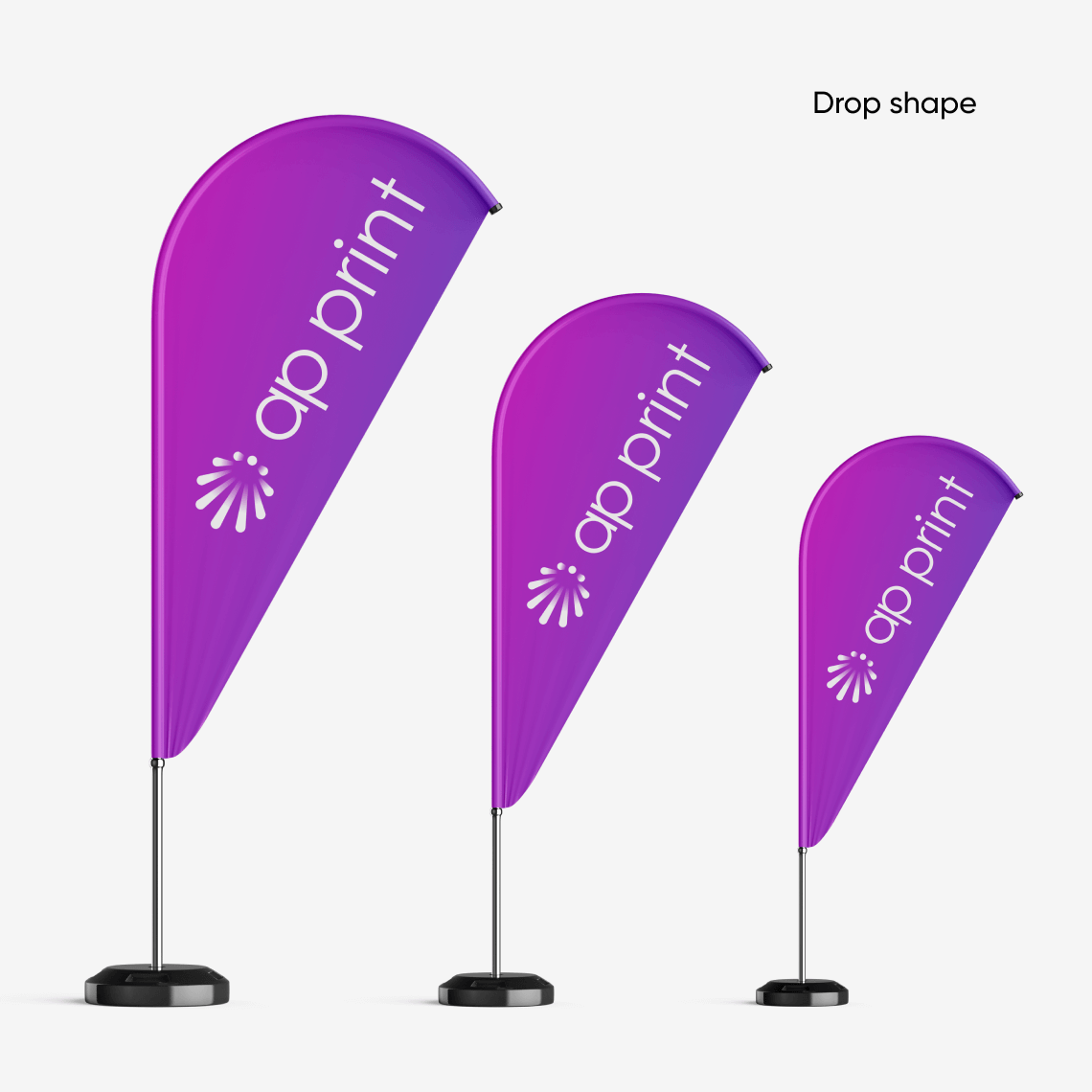We offer several flag shapes and sizes, all printed on durable polyester fabric designed for outdoor use. The flags are easy to assemble, lightweight to transport and come with different base options, allowing them to stand securely on grass, concrete or indoor floors.